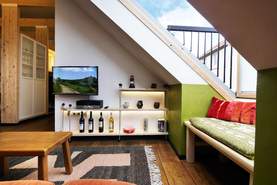 - Großes Cabrio-Dachfenster mit Austritt-Balkon zum Blick auf den Hafen